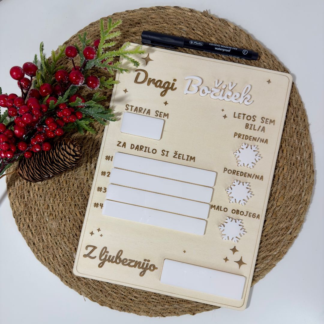 Tabla ima posebno površino, po kateri lahko pišeš s flomastrom in jo enostavno obrišeš – zato je primerna za večkratno uporabo in bo vsako leto del vaše družinske tradicije. 💫