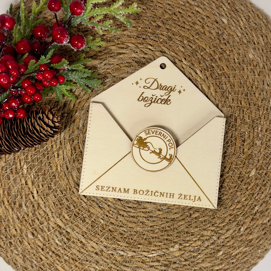 Naše leseno pismo »Dragi Božiček – seznam božičnih želja« je čaroben dodatek k prazničnemu decembru, saj otrokom omogoča, da svoje želje, risbice ali sanje skrbno spravijo v prav posebno kuverto, ki je pripravljena za “odhod na Severni pol”.